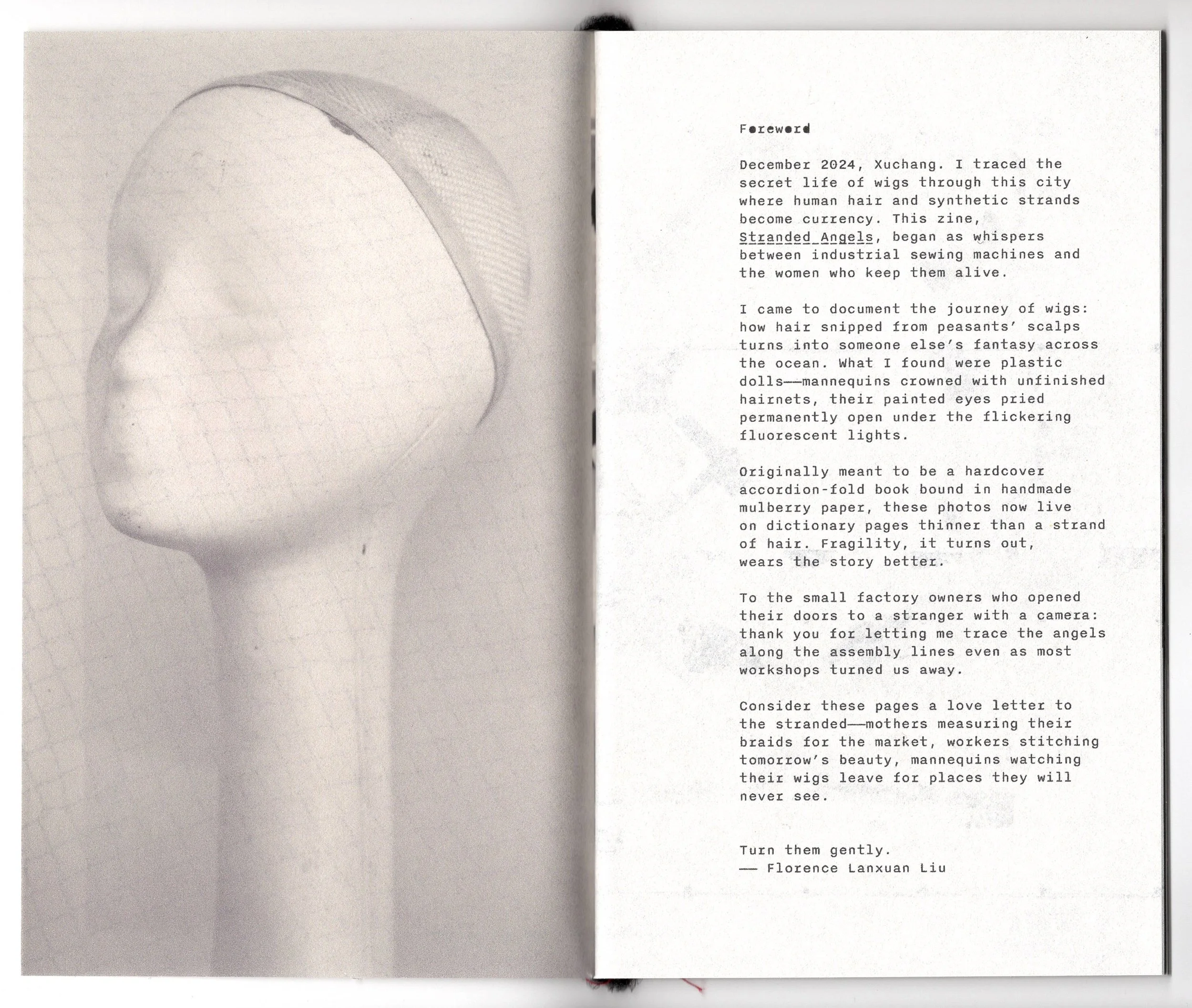 Stranded Angels documents Florence Lanxuan Liu's 2024 odyssey through Xuchang, China—the global center of human hair trade. These black-and-white photographs dissect the wig industry's hidden veins: mothers weighing their braids at market scales, workers stitching beauty into synthetic wefts, and mannequins whose wigs vanish toward horizons they'll never glimpse. Printed on dictionary paper as fragile as the stories it carries, the zine becomes an elegy for the stranded—those caught between rusted machinery and the world's insatiable hunger for perfection.